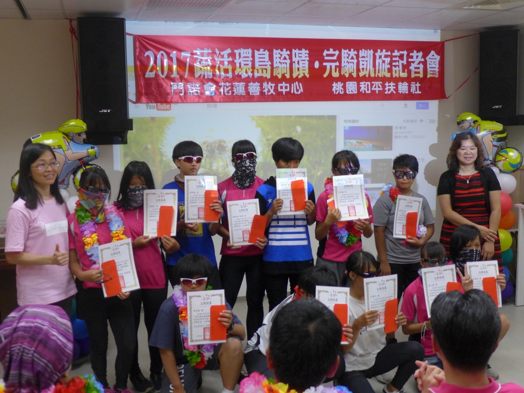 基督教門諾會花蓮善牧中心13名少女,2日從花蓮出發,挑戰13天共657公里的單車環島旅行,14日終於完成挑戰,凱旋歸來!8月14日早上在本中心執行長、董事彭大浩、董事洪玉忠與全體同工、桃園和平扶輪社創社社長徐婉玲Asden、現任社長Lawyer謝清傑社長、副社長House葉麗濱、活動總幹事Kids莊炳楠及社友們列隊迎接下,不少安置少女流下眼淚。頒獎典禮於11點開始,在熱烈掌聲與歡呼中,少女們接下了她們的完騎證書,完成了這次挑戰。