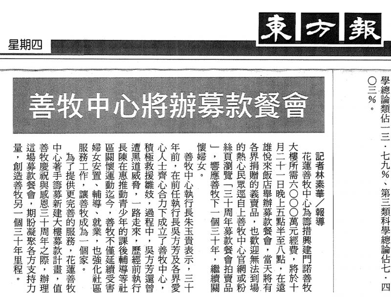 基督教門諾會花蓮善牧中心感謝東方報報導「善牧三十.再攀高峰」募款餐會!當天活動有許多花蓮在地藝術家的逸品拍賣,無法前往的民眾也歡迎點擊以下連結瀏覽型錄,一齊為婦少兒創造溫馨家園!