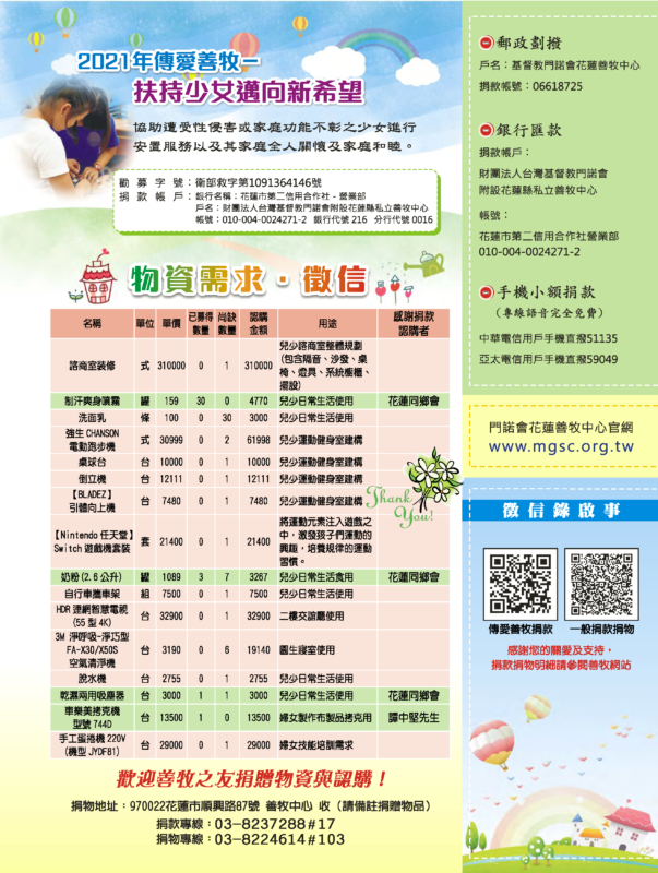 戶名:基督教門諾會花蓮善牧中心