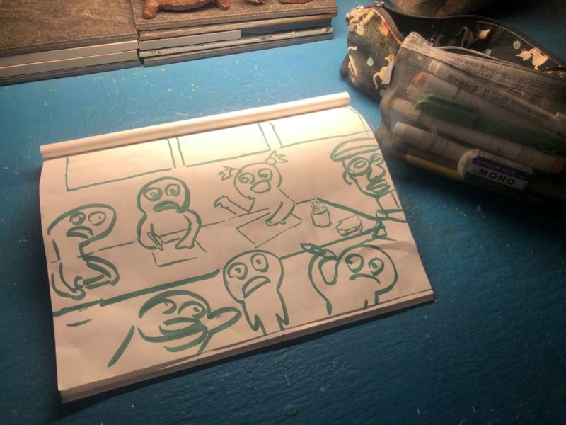 廖仔提到小時候在飛炫屋上課的自己,每周上繪畫課前就坐在客廳等,時間一到立刻彈起來,騎著腳踏車到飛炫屋,因為可以吃糖果。課堂氛圍總是很歡樂,最棒的地方是可以做自己,偶而跟老師鬥鬥嘴,甚至還把自己跟老師的互動過程用畫繪製出來。